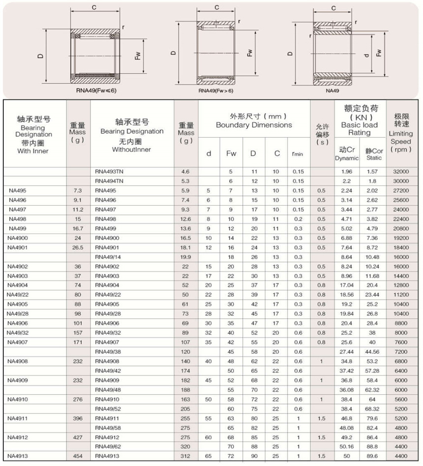 此類軸承有多種結(jié)構(gòu)及尺寸系列,要求軸頸或外殼滾動表面硬度,加工精度和表面粗糙度應與軸承套圈相 同。所組裝G2級滾針,分組批直徑變動量在2 um之內(nèi),除滿裝滾針軸承外,均采用高剛性保持架,能夠正確 地引導滾針平行軸線。