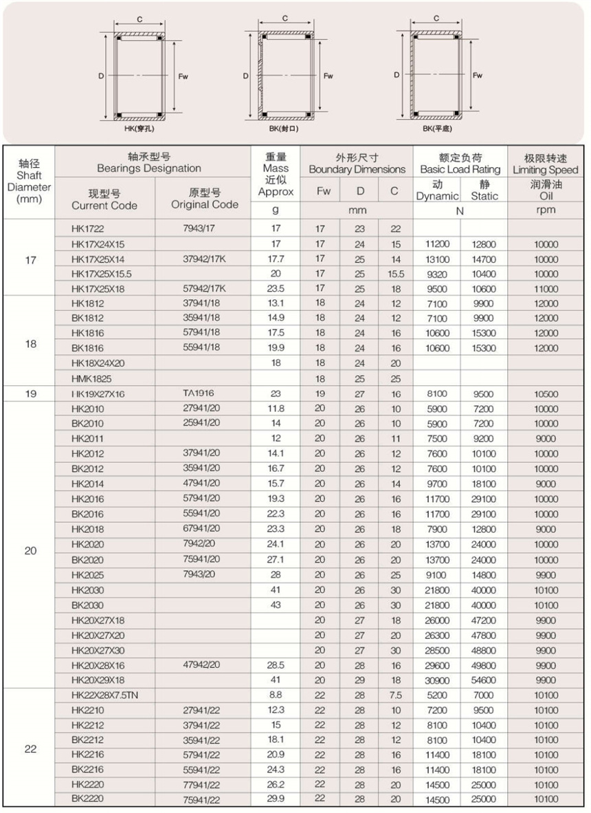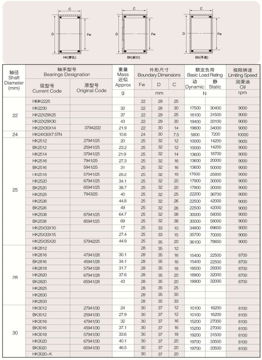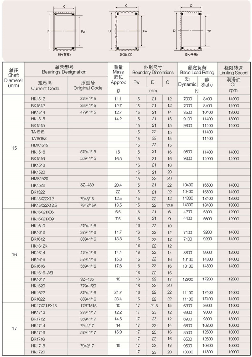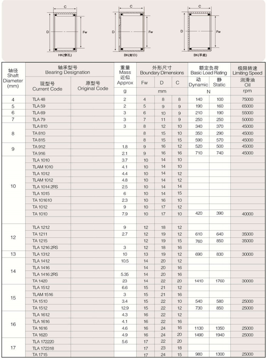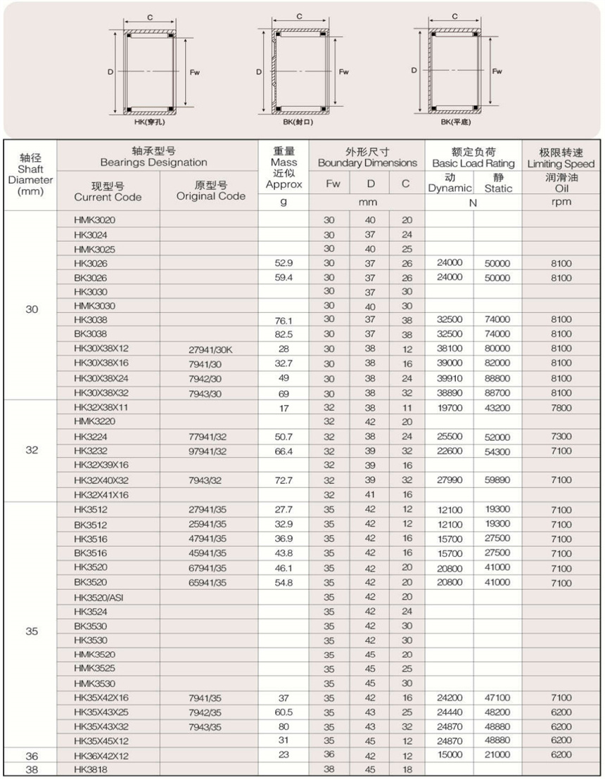 可提供樣本樣品中所列標(biāo)準(zhǔn)和非標(biāo)準(zhǔn)公制尺寸。英制系列沖壓外圈滾針軸承以及外圈有油孔,雙列滾針、 尼龍保持架,有內(nèi)圈、有密封圈等有特殊要求(訂貨時(shí)有特殊技術(shù)要求)高精度的沖壓外圈滾針軸承。