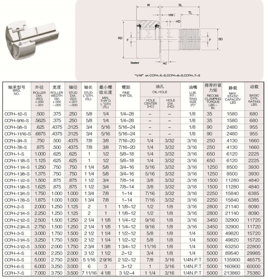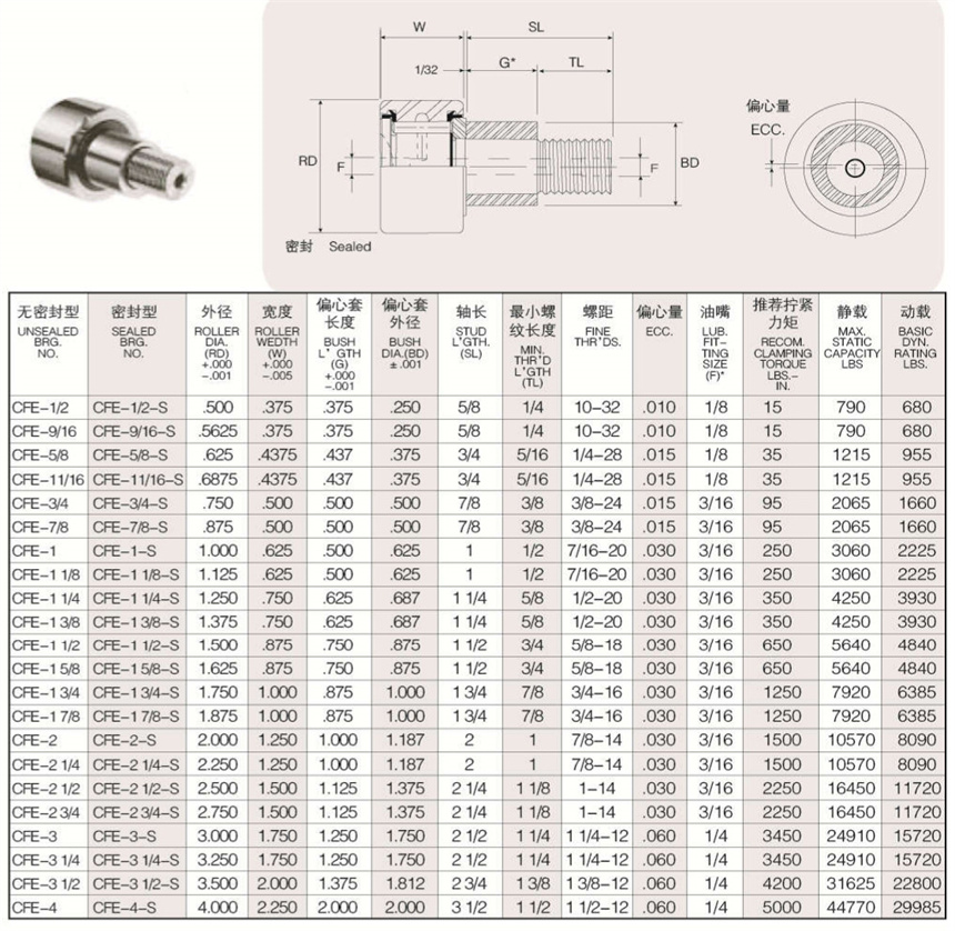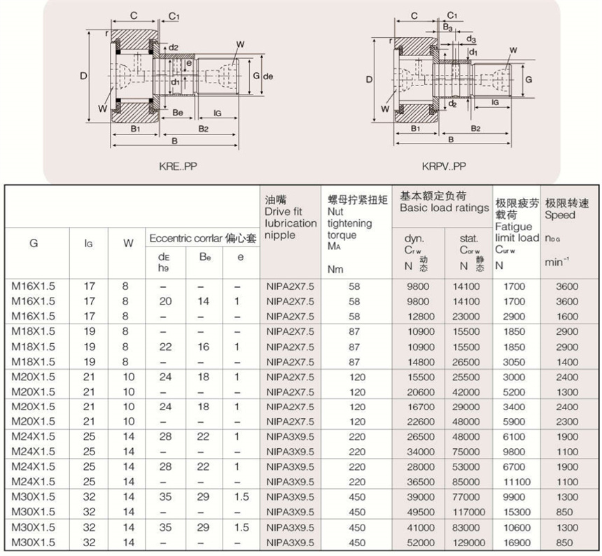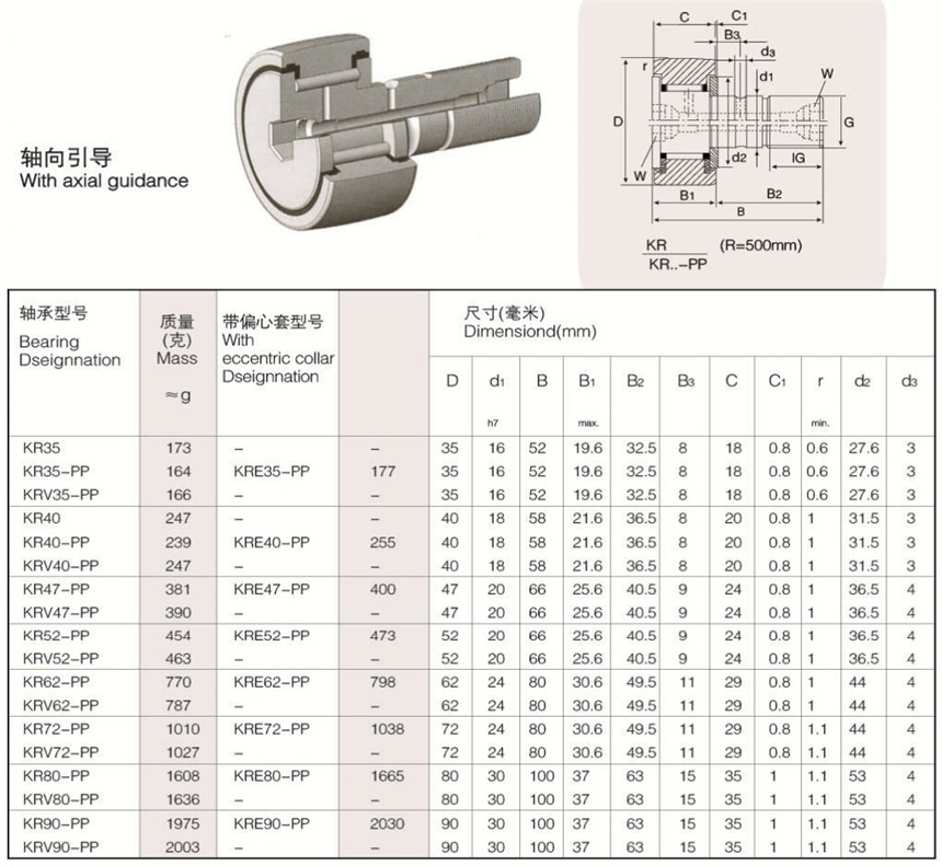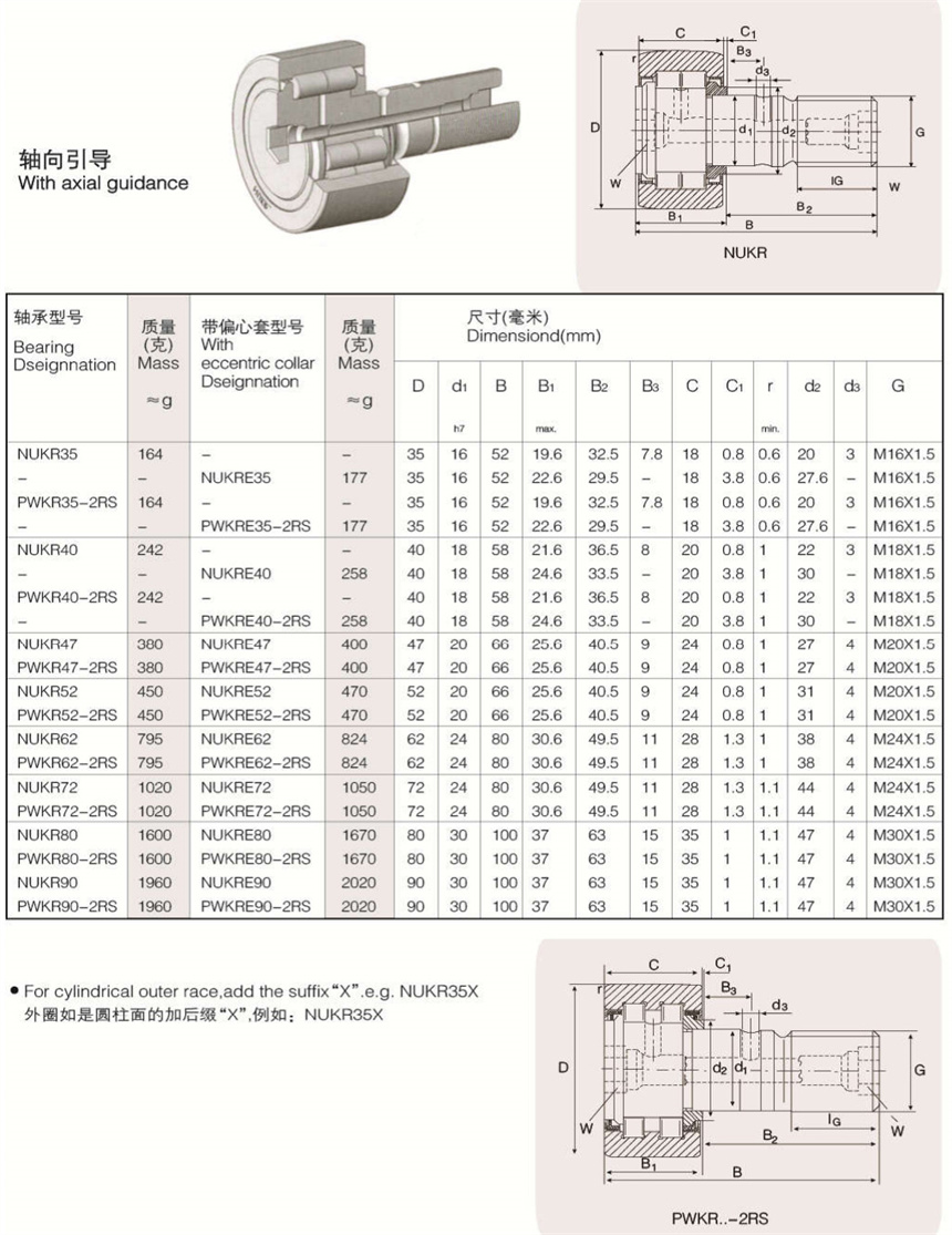 KR22PP螺栓型滾輪軸承一般為滿裝滾子結(jié)構(gòu),螺栓軸滾道部位經(jīng)過淬火,為避免應(yīng)力集中,滾輪的厚壁外圈外表面為弧形。外圈有兩個整體擋邊,軸向由滾子引導(dǎo)。螺栓軸頭部和壓裝的側(cè)擋圈通過滾子為外圈提供軸向支承。