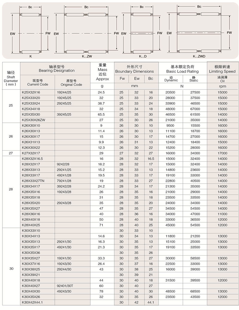 向心滾針和保持架組件為一獨立的軸承元件,其中每個滾針由保持架精確地引導和保持。它實現(xiàn)了最小的結構空間下具有高負荷能力和高剛性的軸承設計。保持架的兩引導面間距寬廣,保證了滾針和保持架組件的精確引導。滾針和保持組件適用于軸和座孔可作為滾道之處,在具有高尺寸精度、幾何精度的軸和座孔滾道下,可得到最高旋轉精